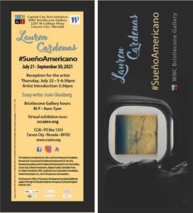 Western Nevada College’s Bristlecone Gallery, 2201 W College Parkway, Carson City. The exhibition will be in the gallery from July 21 – September 30, 2021. The college and CCAI will host an artist’s reception on Thursday, July 22, 5 – 6:30pm. The gallery is open to the public, M-F, 9am – 7pm. To watch the artist interview and exhibition tour, click www.youtube.com/watch?v=0e7YDI39BbE