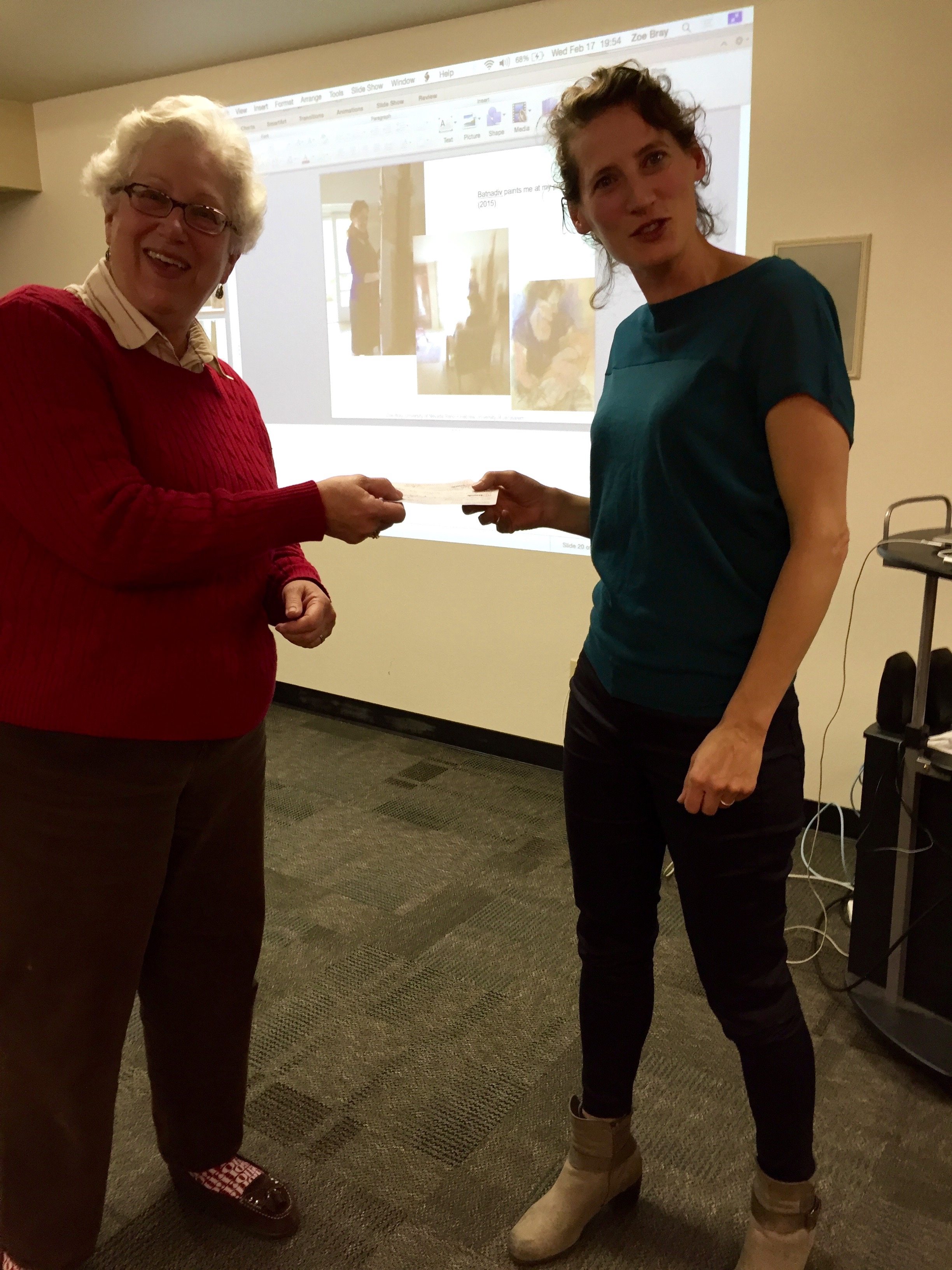Ruth Giovacchini, CCAI board member, giving Zoe her honorarium and travel checks, 2/17/16