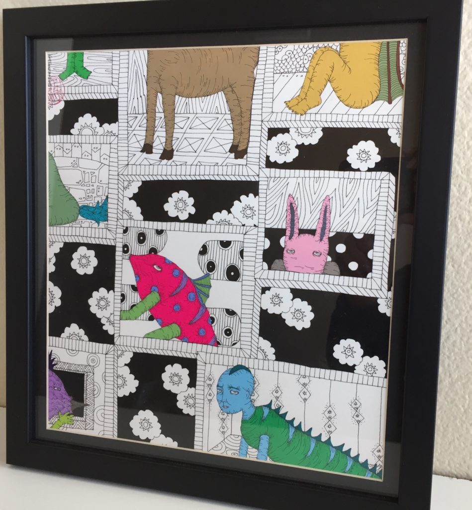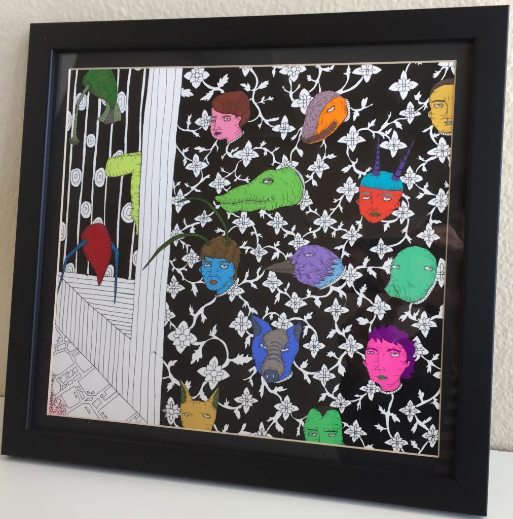 “Play Time,” Cyndy Brenneman, watercolor, pen, ink, 8.5″x8″, 2017
