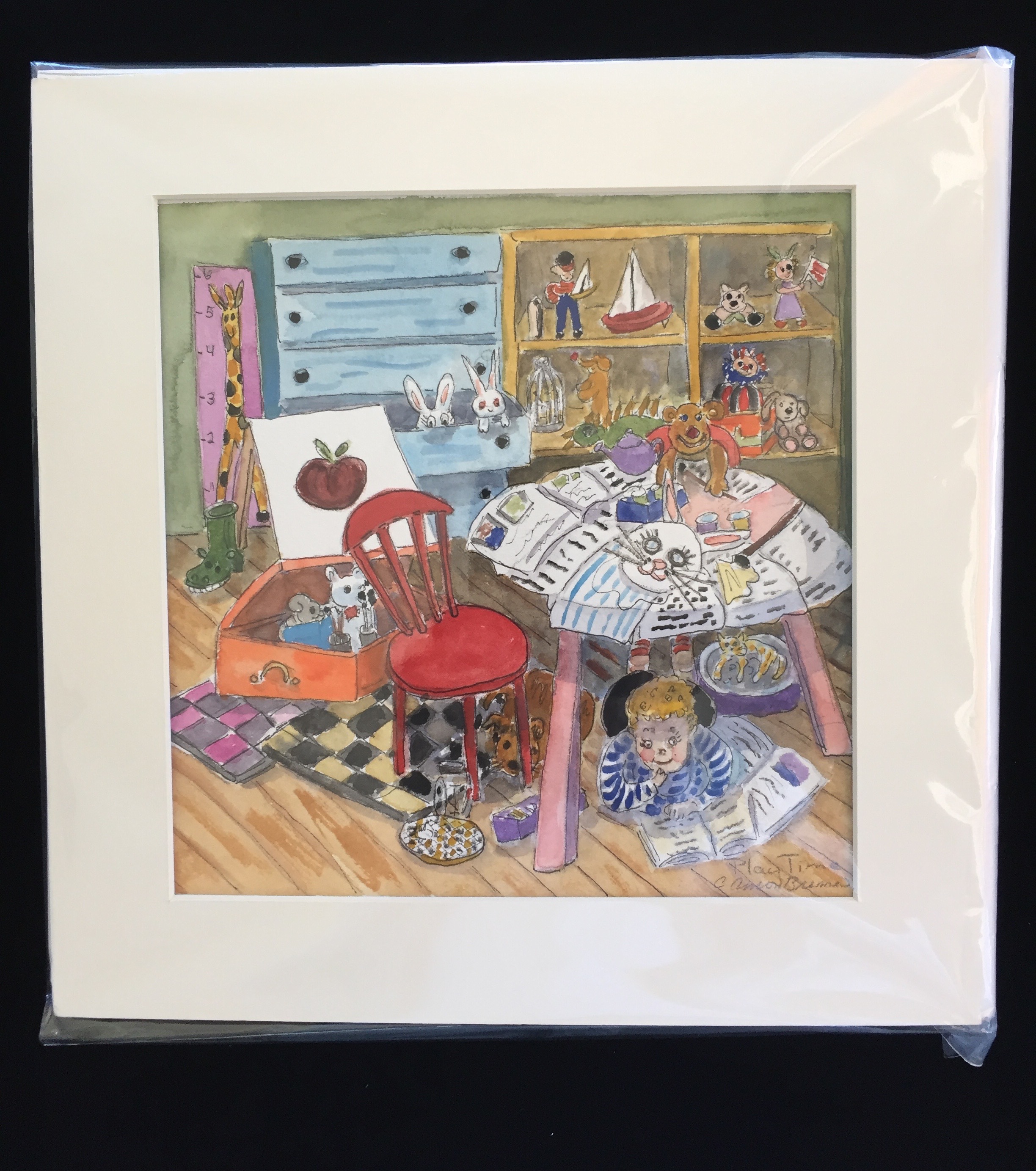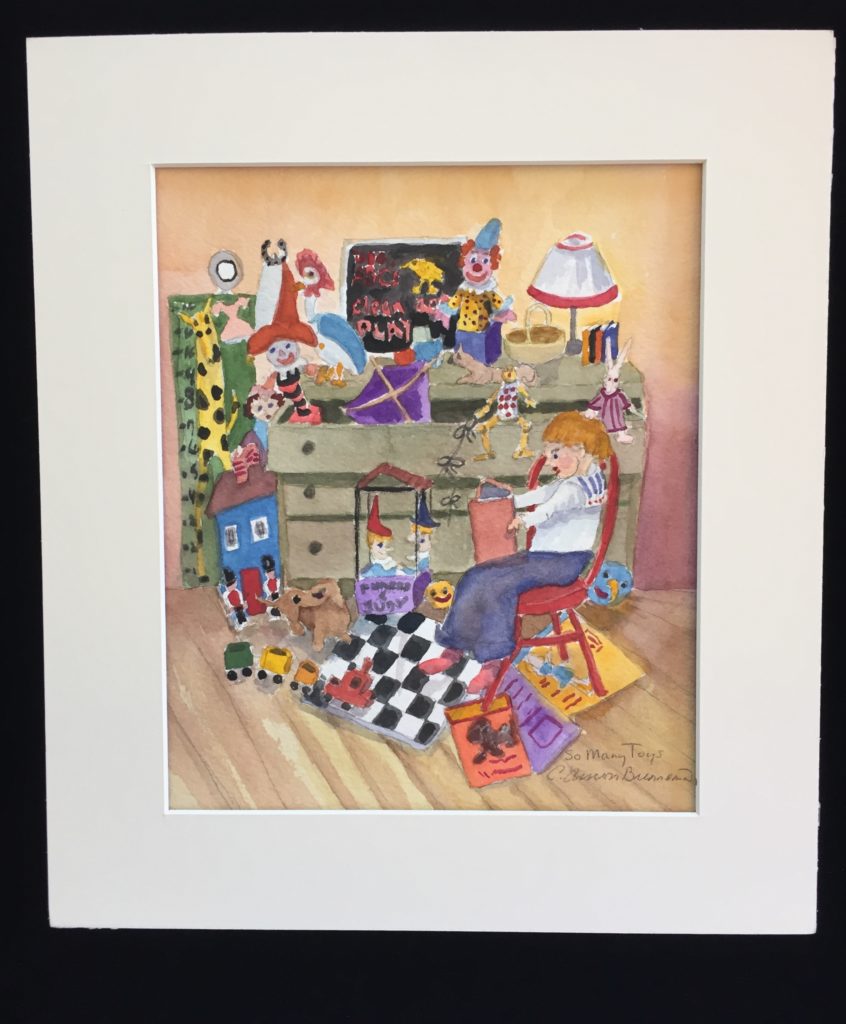 “So Many Toys,” Cyndy Brenneman, watercolor, 9″x7.5″, 2017