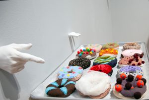 image, right: Doughnut Dreams; 18″x 24″x 4″; screen printing, sewing, relief, aluminum tray; 2021