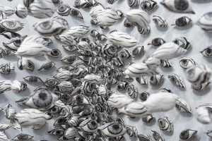 To show the mass consumer culture where humans live in today’s contemporary society, Koh employs different types of printmaking techniques incorporating other media such as relief, intaglio, screen printing, as well as digital processes, and new technologies like laser cutter and 3D printer that she combines with sewing, ceramics, bookbinding, etc. She also experiments with human-made materials such as plastic boxes, vinyl sheets, and paper bags, products that symbolize our micromanaged and controlled society.