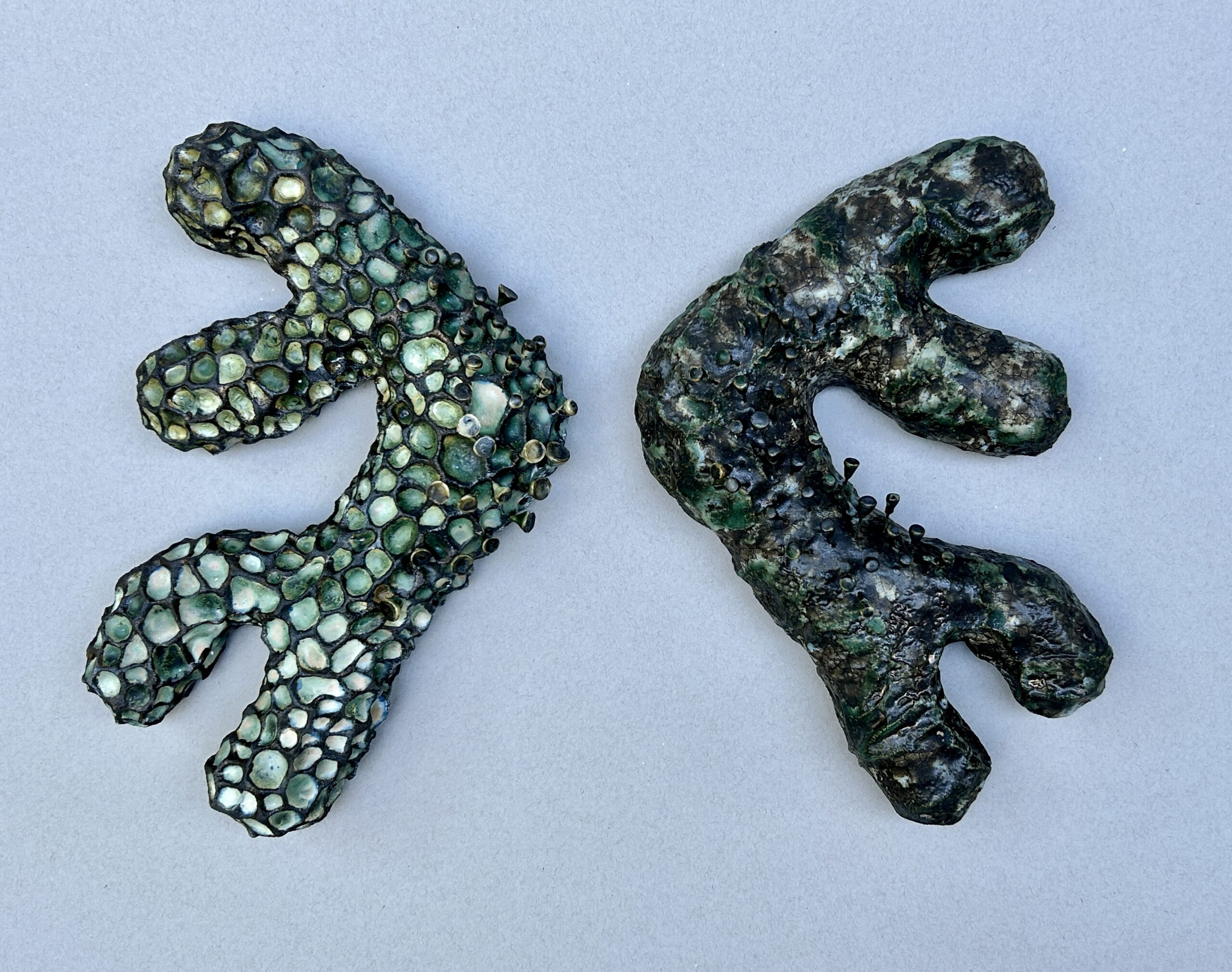 left image: Elaine Parks, Tufa Creatures, ceramics, 2025