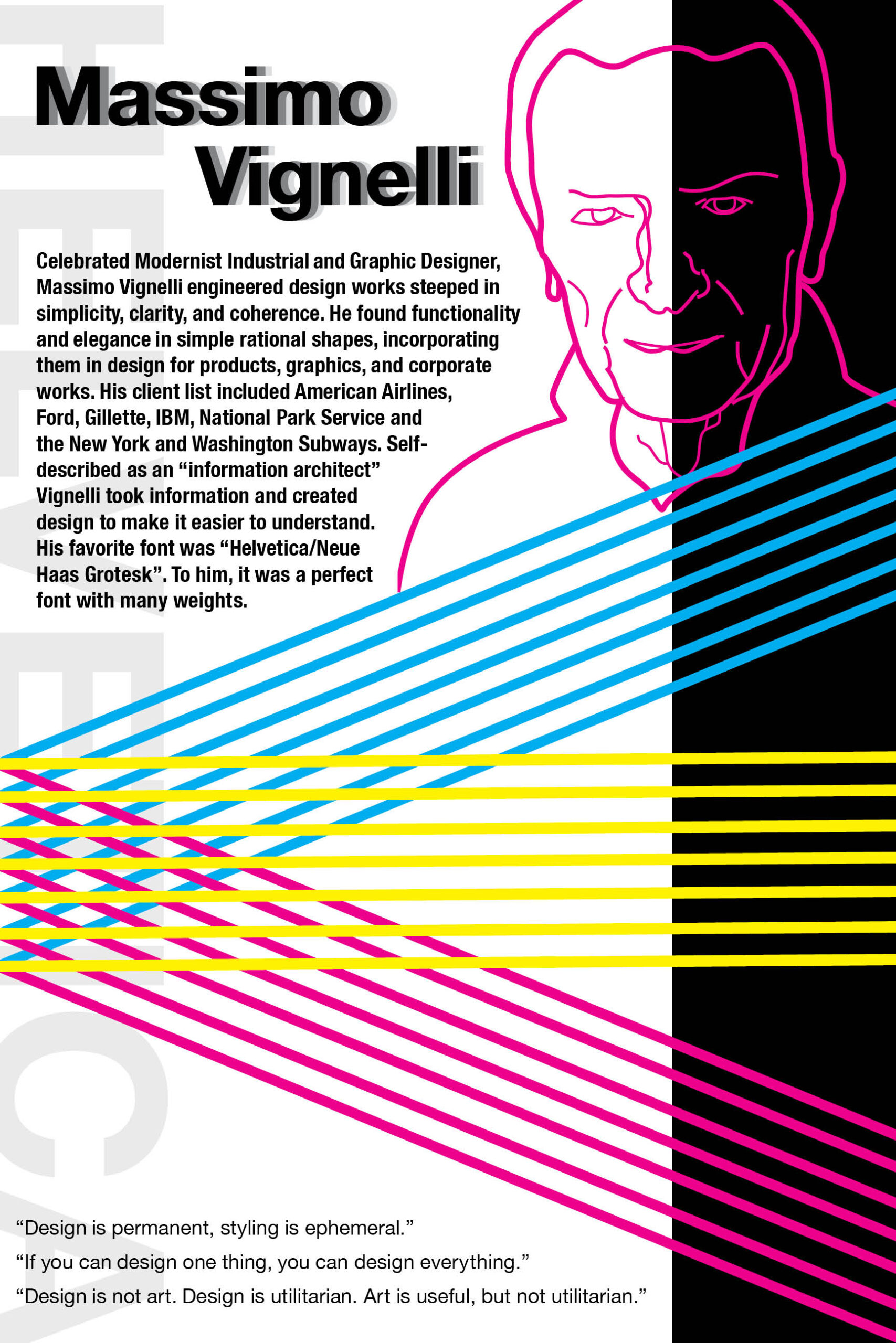 “The Massimo Vignelli poster was assigned in an advanced graphic design class (GRC 220 – Graphic Design 1). As a tribute to some of the most noted designers in the graphic design field, the students were asked to create a poster showcasing a famous graphic designer. They were required to research designers and, after choosing one, create a poster reflecting the designer’s style – without simply copying their work. While researching, they had to ask themselves what characteristics made that designer’s work so unique – what was their ‘claim to fame?’ An understanding of these ideas helped them create visually interesting designs, echoing the work of Vignelli.”