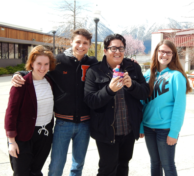 [center image: Justin with Douglas High students and the surprise gift, a donkey pinata, they made for him]