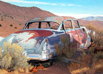 On the Ground and in the Open Air Painting, in particular oil paintings in which the hand of the artist is visible, are an intermediary step (hence a “medium,” if you will) through which we have a still image of the world that more closely approximates how we think about it. The eye of the painter, in choosing deliberately to emphasize certain features over others through scale, intensity of color, and perspective, is more accurate to the mind than the photograph. And there is such a vivid pleasure in that fact. Painting in the American West, once it got over the heroic gestures of Albert Bierstadt and Thomas Moran, settled into a more topographically accurate depiction of the environment in the works of Thomas Hill and William Keith, both of whom worked in California and in the Sierra. Yet it remained a medium in which things were presented as they appeared to the mind, not to the lens of the camera. The terrain, which had first appeared so awesome to the naive vision of emigrants, was slowly becoming a territory. And the fashions in painting were changing as well, the European landscape painters slowly abandoning histrionic paintings in favor of those that showed how we actually encountered the world. Painting outside thus became a central tenet for the impressionist painters in France during the mid-nineteenth century, artists who sought to portray the world as it was, not as it ought to be. Soon after the turn of the century plein air became a favored technique of the landscape artists working in the American West. They were led by painters such as Maynard Dixon, whose graphic style early in the twentieth century derived from his magazine and mural work, but was informed by painting in the open air. Edgar Payne and Paul Grimm were two notable plein air California painters of the same generation. Payne, who worked from Monument Valley to the Sierra Nevada, was noted for his mountain views executed in short and vivid brushstrokes. Grimm, who moved to Palm Springs in 1932 and became the state’s premiere desert painter, was more of a realist and often let the sky dominate his landforms over long vistas. The heritage of these painters is evident in the work shown at the Great Basin Gallery. The three painters in this exhibition have in common both the landscape of northern Nevada and their physical presence in it as a working practice. But their pictorial strategies differ somewhat, although they also share common roots in these painters. Your vision is constantly in play between foreground and background in a Nicholson painting, even when the former is dominant, as in his painting of an automotive relic nestled in desert shrubs. The rusting trunk and flanks of the old Cadillac near Silver City take up most of your immediate attention, but you can’t help following the lines of the car to the ridges beyond. The painting is meticulously composed to lead our eye—but this is also our experience in the Great Basin, always lifting our vision to take in the landscape.