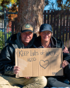 When he photographed people for his “E. Washington Street” series, Angel Vega also gave them cardboard and a marker, interviewed them, and shared their stories with viewers. Vega said, he worked “getting to know the homeless individuals, building trust, and helping however I can. I always explain the project to them and take the picture when the time feels right.” A card with interview notes accompanies each photo in the exhibition.