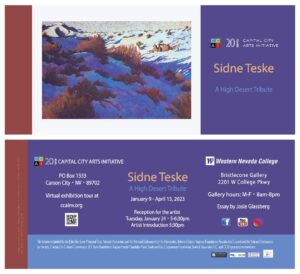 The free exhibit is open to the public January 3 — April 11, 2023, Monday through Friday, 8 a.m. to 7 p.m., in Western Nevada College’s Bristlecone Gallery, 2201 West College Parkway, Carson City. Join CCAI for the opening reception, Tuesday, January 24, 5:00 p.m. – 6:30 p.m with the artist introduction at 5:30 p.m. Watch Sidne’s interview and the exhibition tour here: https://youtu.be/c9yiwxxN4I0