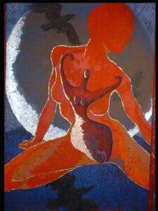 2nd image, left: Sidne Teske; Luna; soft pastel with gold, silver, copper leaf; 32″x47″; 2005