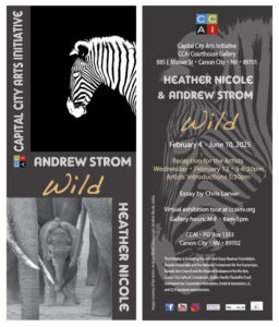 The Capital City Arts Initiative’s exhibition, Wild, presents work by Nicole and Strom at the Courthouse Gallery from February 4 – June 10, 2025. CCAI will host a reception for the artists on Wednesday, February 12, 5:00 – 6:30pm with the artists’ introductions at 5:30. The Courthouse is located at 885 E Musser Street, Carson City; the gallery is open Monday – Friday, 8:00am – 5:00pm. Click https://youtu.be/SUeCday-iko to watch the artists’ interviews and exhibit tour.