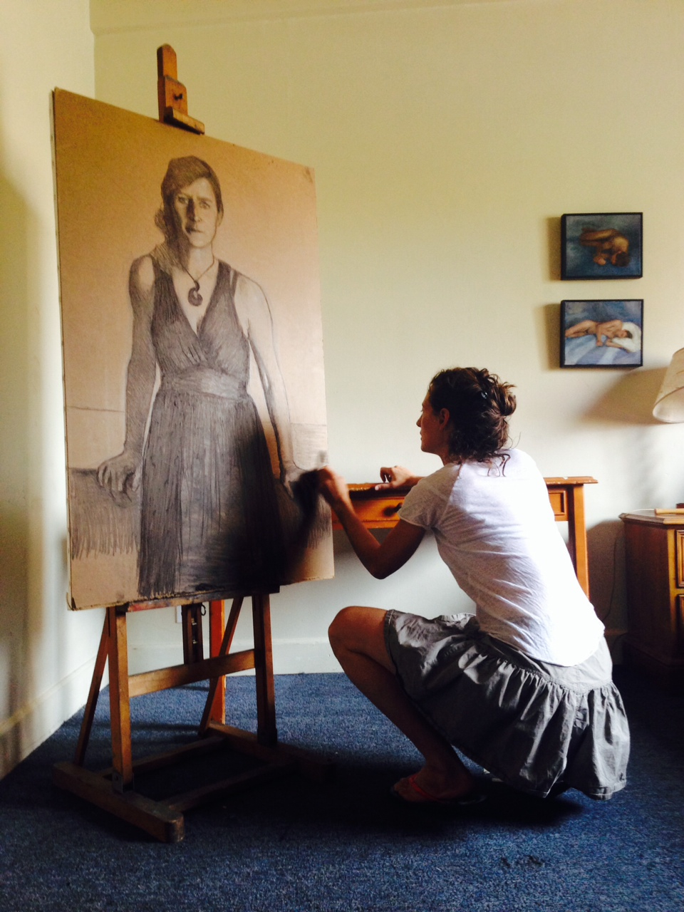 top image, right: Zoe Bray; studio view of drawing Frances Melhop, in Reno, charcoal on board, 2014