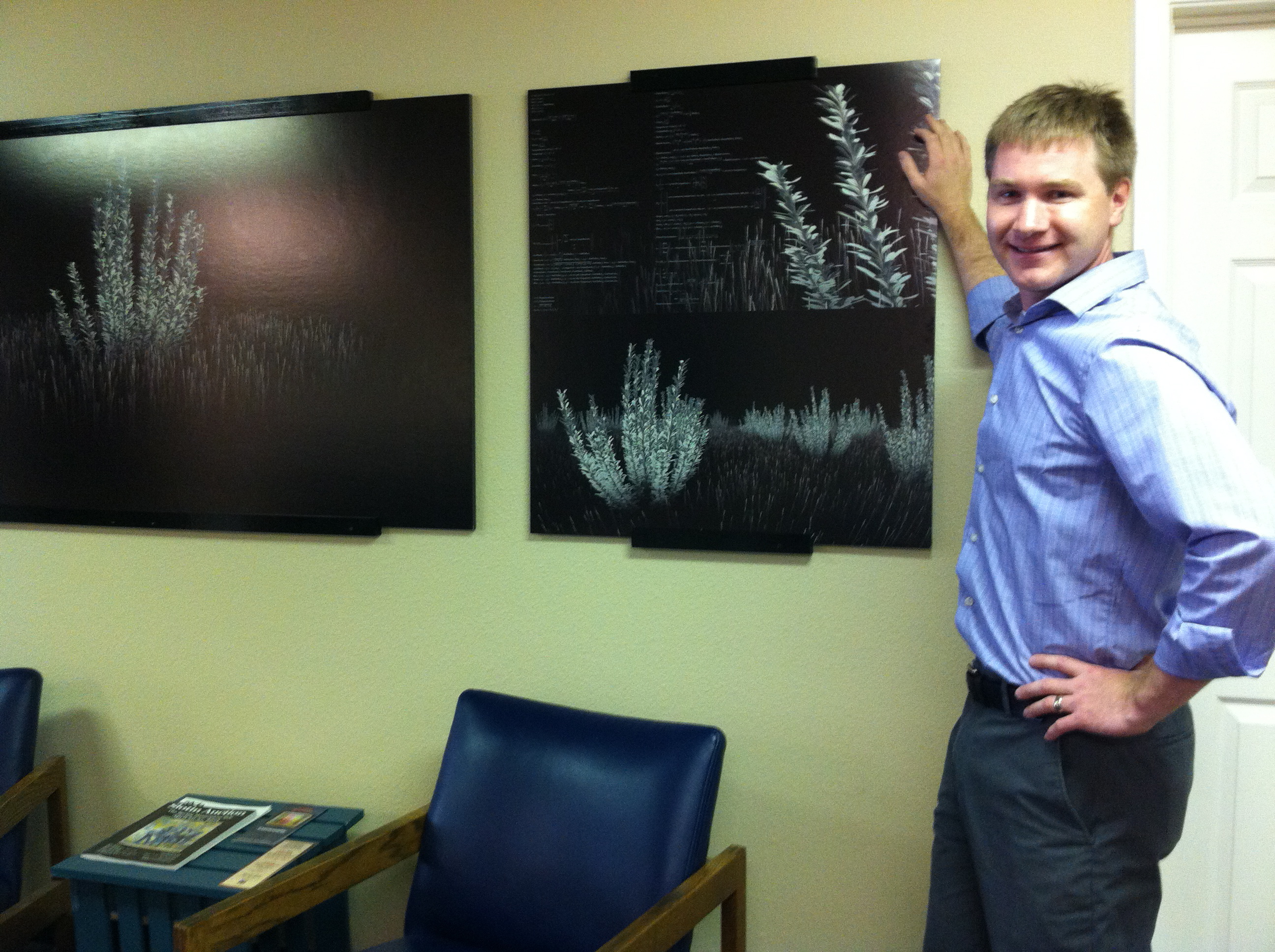 Mimi Patrick’s mixed media ceramics begin the story of a mythological people from somewhere near here with relics from the archeological dig that revealed their existence. Ben Hoffman’s large mathematical digital images give viewers a new prospective of sagebrush. Stephen Reid’s abstract black/white drawings also tell a story of imaginative travels and his lively watercolors fill the office they occupy with color and action. Steve Davis’ strong black/white landscape photographs feature images from the Black Rock desert and the Stillwater National Wildlife Refuge near Fallon. Weaver Jill Altmann wove a large robe from rayon raffia and gold metallic yarn. Andy Gallian’s etchings invite close inspection as he takes viewers into the world of flowers, poetry, and the night sky. Emily Silver painted her large landscapes during a residency at Springs Preserve in Las Vegas.