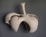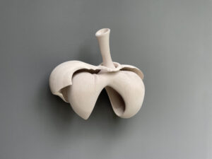 LB Buchan describes the work: “Many of my show and sculpture titles are often derived from scientific names of the things I’m currently exploring. Callosum comes from corpus callosum, which is a large nerve tract connecting the right and left hemispheres of the brain, and allows communication between the two hemispheres. In Latin, it means ‘tough body’. To give you some context/background, this body of work based on anatomy is specifically about the manifestation of post-traumatic stress in the body. The same things seem to appear over and over- primarily lungs, diaphragm, and abdominal anatomy. This isn’t consciously intentional – it is just how I work, whatever comes out is what comes out, but breath and breathing do seem to be a central focal point. Most of the pieces have a strong botanical or sea life flair to them, especially some of the larger ones I’m working on.