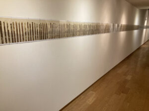 2nd image, left: Lauren Cardenas; 608; installation view 11” x 60’; each print: 3-colored letterpress print on Kitikata paper; 11”x14″; 2021
