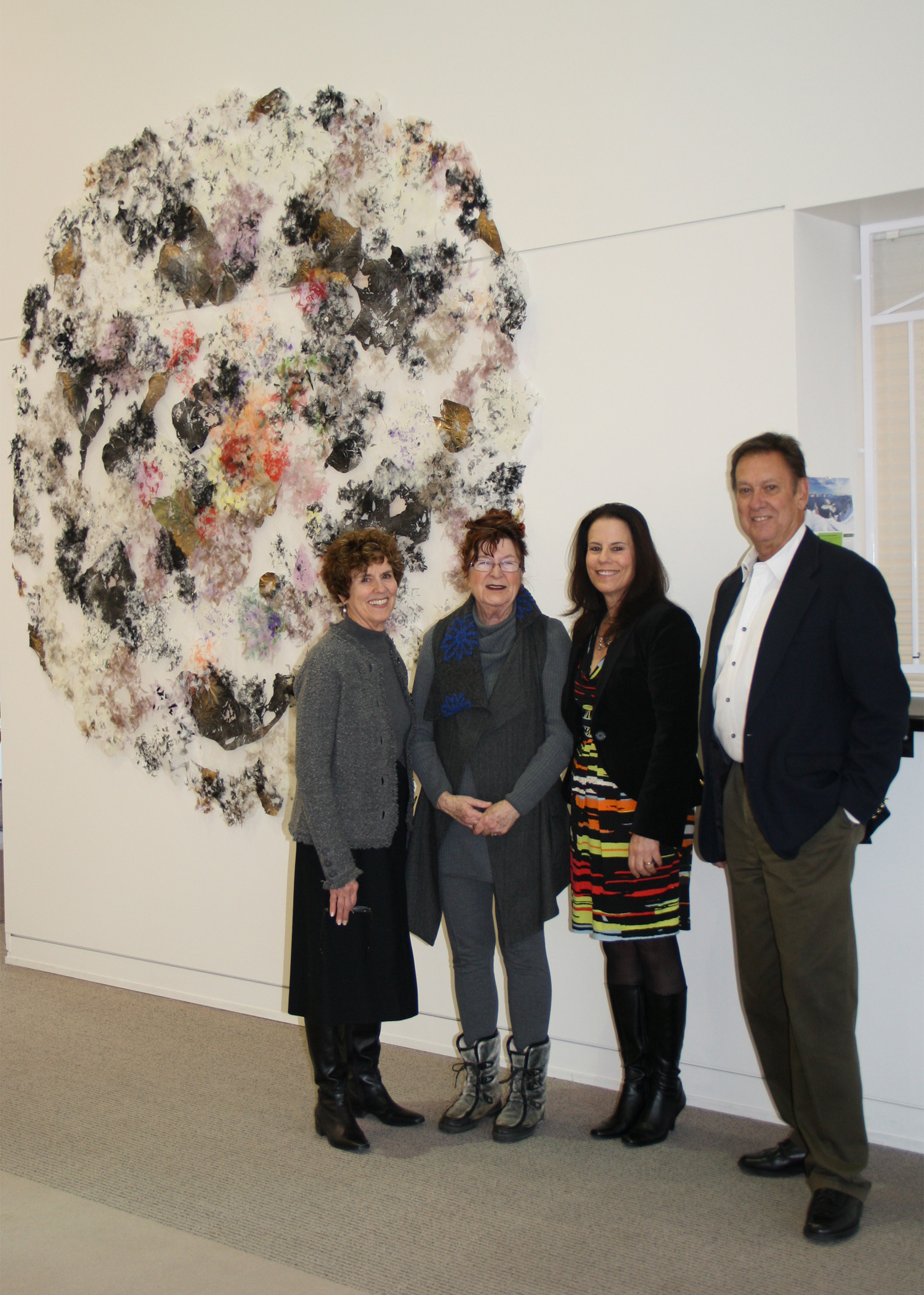 bottom image, at the artist’s reception: [l-r] Sharon Rosse, Cyndy Brenneman, Cathy Breslaw, Glenn Clemmer