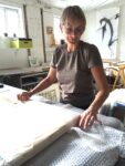 top image: Amelia Currier in her studio center image: After Hokusai, encaustic monotype with ink, 26″ x 19″ bottom image: Glyphs and Houses exhibition flier