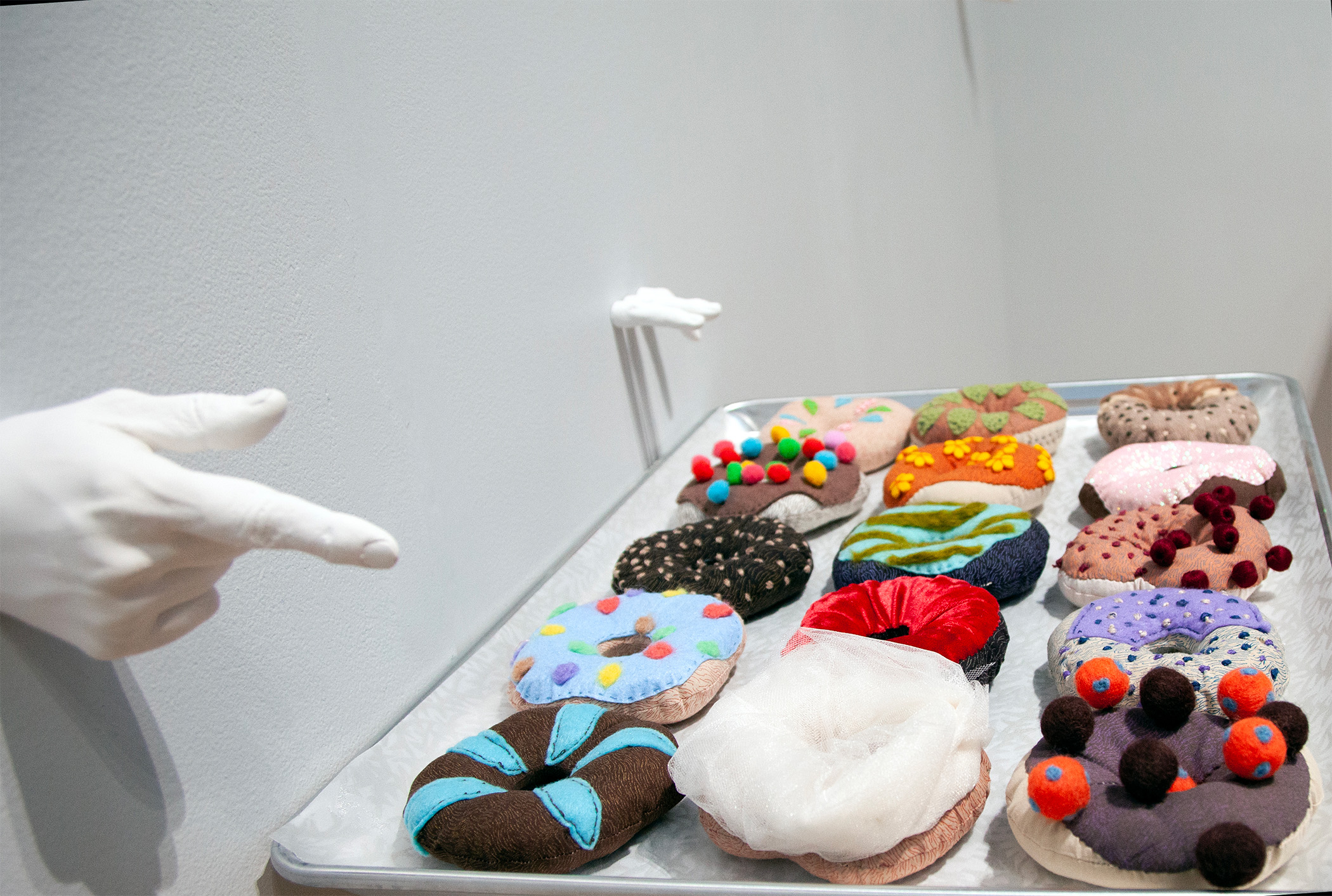 image, right: Doughnut Dreams; 18″x 24″x 4″; screen printing, sewing, relief, aluminum tray; 2021