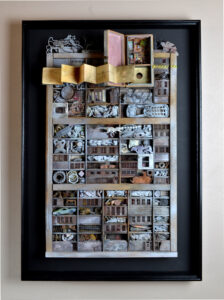 right image: Sue Cotter, Eucatastrophe, mixed media assemblage, 33″x 23″x2.5″, 2023