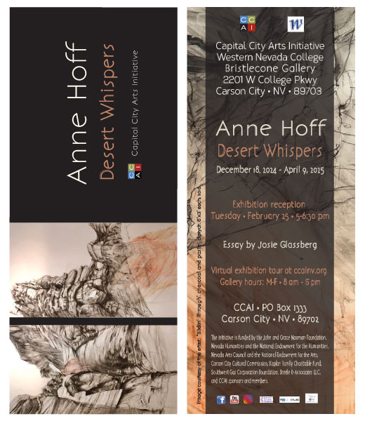 CCAI’s exhibit will be in Western Nevada College’s Bristlecone Gallery, 2201 W College Parkway, Carson City from December 18, 2024 — April 8, 2025. The gallery is open to the public, Monday through Friday, 8am – 5pm. The artist’s reception will take place on Tuesday, February 25, 5–6:30pm. Click https://youtu.be/P1yqJBk66QE to watch the artist’s interview and gallery tour.