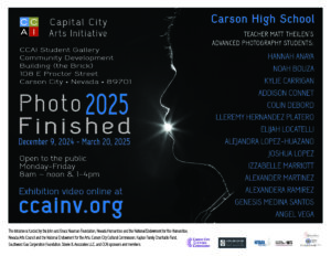 Photo Finished 2025, a Capital City Arts Initiative (CCAI) student exhibition, is in the Community Development Building (the Brick), 108 E Proctor Street, Carson City, December 9, 2024 – March 20, 2025. The Brick is open to the public, M-F, 8am – noon, 1-4pm. Click here to watch the artists’ interviews.