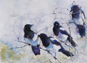 top image, right: Colleen Reynolds; Tribal Branch; watercolor, 16″x20″, 2019