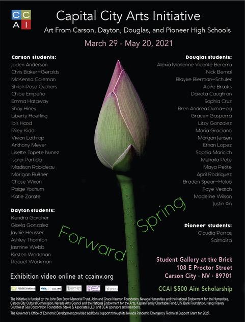 The Capital City Arts Initiative (CCAI) announces its exhibition, Spring Forward, at the Community Development Building (the Brick), 108 E Proctor Street, Carson City, through May 20, 2021. Students from Carson, Dayton, Douglas, and Pioneer high schools have work in the exhibit which is available online at ccainv.org. Please note, while the building is presently closed to the general public, an online exhibition tour is available at www.youtube.com/watch?v=x8tmKYKJiOE