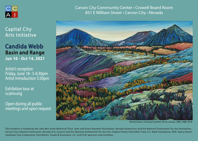 Center’s Crowell Board Room from June 16 – October 14, 2021. The Community Center is located at 851 E William Street, Carson City and is open during all public meetings and on request. The Initiative will host a reception for the artist in the Crowell Board Room, Friday, June 18, 5 – 6:30pm. To watch the artist interview and exhibition tour, click https://youtu.be/TiJ9qvxHm0A