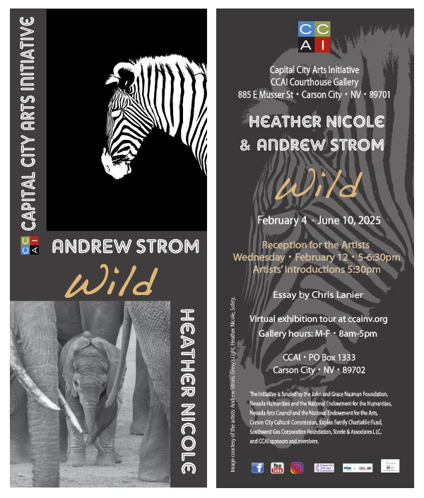 The Capital City Arts Initiative’s exhibition, Wild, presents work by Nicole and Strom at the Courthouse Gallery from February 4 – June 10, 2025. CCAI will host a reception for the artists on Wednesday, February 12, 5:00 – 6:30pm with the artists’ introductions at 5:30. The Courthouse is located at 885 E Musser Street, Carson City; the gallery is open Monday – Friday, 8:00am – 5:00pm. Click https://youtu.be/SUeCday-iko to watch the artists’ interviews and exhibit tour.